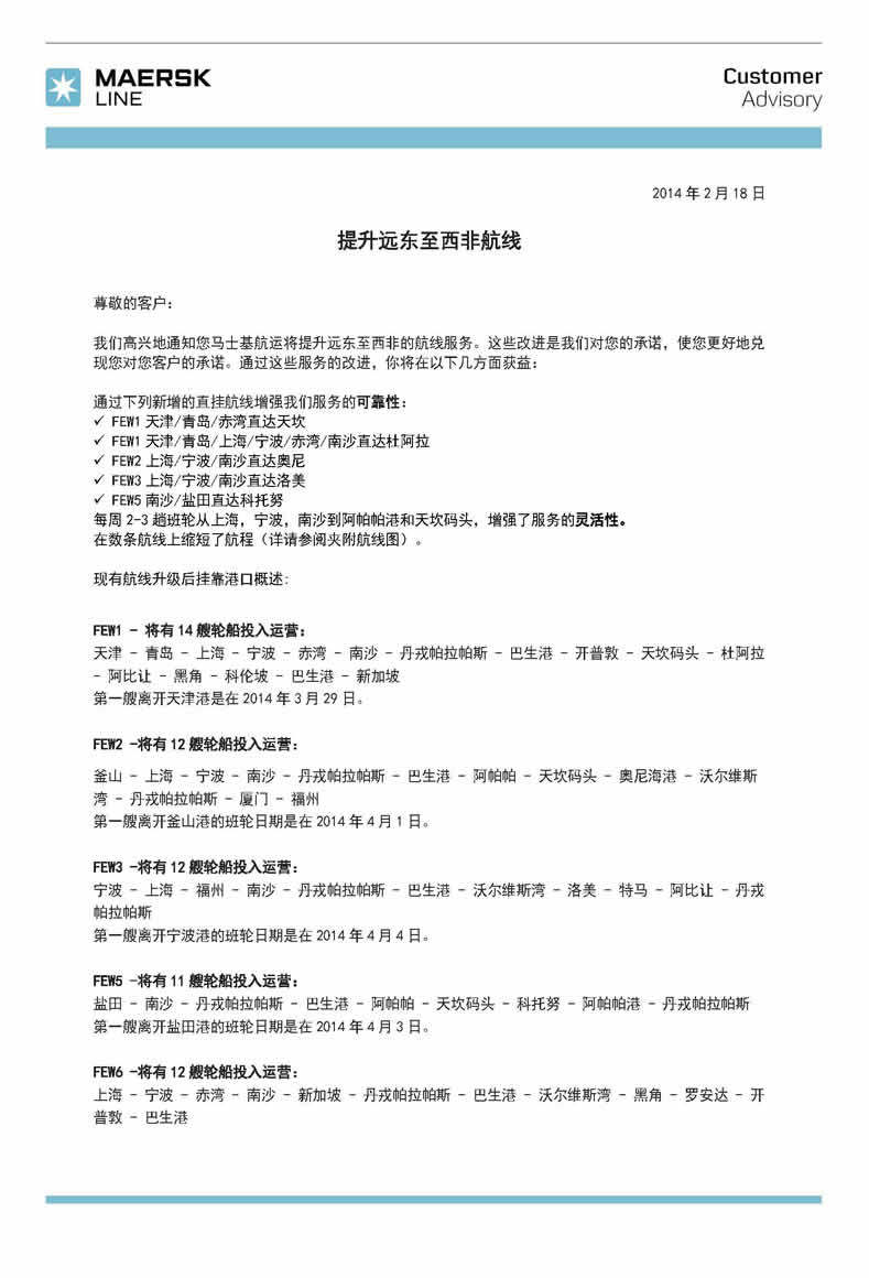 馬士基西(xī)非航線直航推廣,4月(yuè)份開(kāi)♠¶π始每周三班船(chuán)直靠TINCAN,兩班船(chu>®<án)直靠APAPA,所有(yǒu)西(xī)非基本港直航
