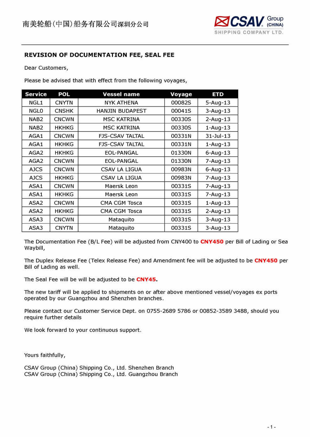 接到(dào)CSAV的(de)通(tōn©€✘♣g)知(zhī),從(cóng)2013年(δσλnián)8月(yuè)走船(chuán)起,各航線'£★₹DOC和(hé)SEF上(shàng)調如₽<(rú)下(xià):